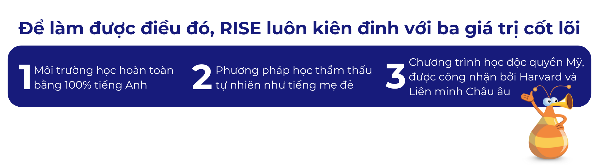 Chúng tôi tin rằng giáo dục đúng đắn luôn bắt đầu bằng sự nghiên cứu kỹ lưỡng và chọn lọc nghiêm túc. Vì vậy, RISE luôn theo đuổi mục tiêu đưa các chương trình giáo dục quốc tế hàng đầu được bảo chứng bởi Harvard và EU về Việt Nam. Điều quan trọng hơn, chúng tôi muốn tạo ra một môi trường nơi trẻ được học tập, tiếp thu, rèn luyện và tư duy bằng tiếng Anh giỏi như trẻ bản xứ.